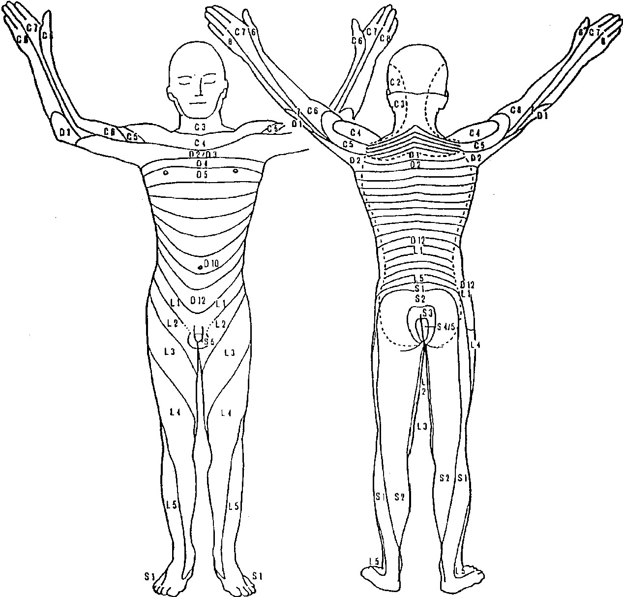 In dem Schema werden alle Hautbezirke durch einen Arzt oder eine erfahrene Pflegeperson besonders (am besten farbig) gekennzeichnet, an denen die Hautempfindung (Sensibilität) vermindert (gelb) oder aufgehoben (rot) ist. Diese Hautzonen müssen besonders geschützt und beobachtet werden.